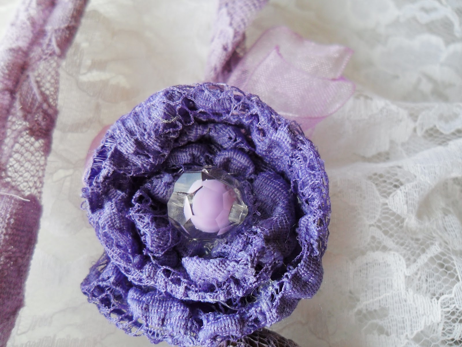 Преди няколко дни , докато ровех на таванчето за старите тениски за постелката се натъкнах на две прекрасно - лилави дантелени парчета . Първо си помислих , че много добре бих облякла някоя кукла с тях , но после ми дойде друга идея . За нов гердан !